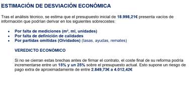 Te entregamos una estimación real de la desviación económica final. Con nuestro informe, sabrás exactamente cuánto margen de negociación tienes y cuál será el coste final real de tu obra.