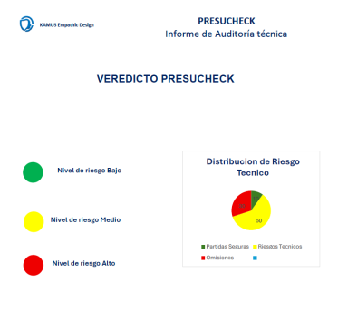 Identificamos visualmente mediante nuestro Semáforo Presucheck el nivel de peligro de tu inversión. Detectamos 'olvidos' deliberados o errores de cálculo que suelen derivar en sobrecostes imprevistos.